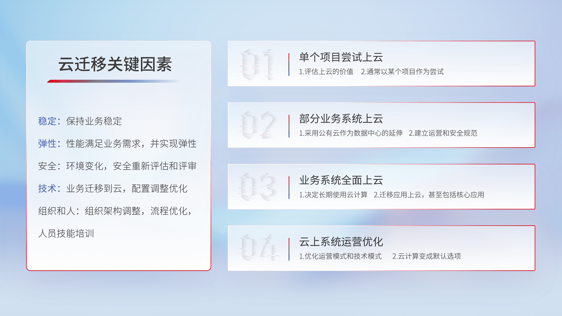结合实际业务,,,,从规划设计、、、云平台选型、、、、云原生改造、、、数据迁移、、、集成交付,,,迁移全过程为客户识别最佳上云路径,,,做好风险识别管理,,,设计网络架构、、、身份权限、、、安全审计合规、、、、操作审计、、日志审计、、、、监控告警策略、、多站点容灾设计等,,对云上基础设施进行整体规划,,,提升IT治理水平,,以满足弹性、、、高可用、、、、高性能的需求。。