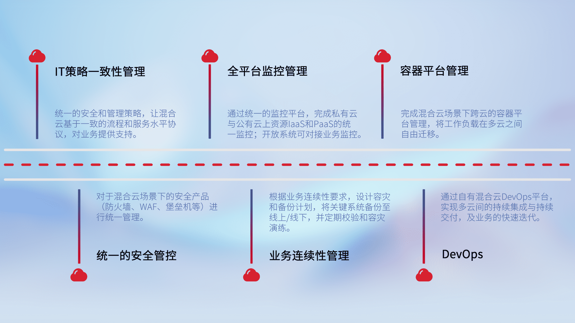 通过多云纳管,,,,以统一的资源数据模型把客户的云资源进行抽象和封装,,,进而实现对多云资源的统一操作,,保障云资源管理的可靠性、、、、稳定性与可用性。。。量身定制化运维内容,,,,配置、、、开发运维、、、补丁管理、、备份、、、、监控、、、认证和访问管理、、审计和日常巡检等,,保障在用云过程中的可靠度,,稳定度以及高可用率。。。。